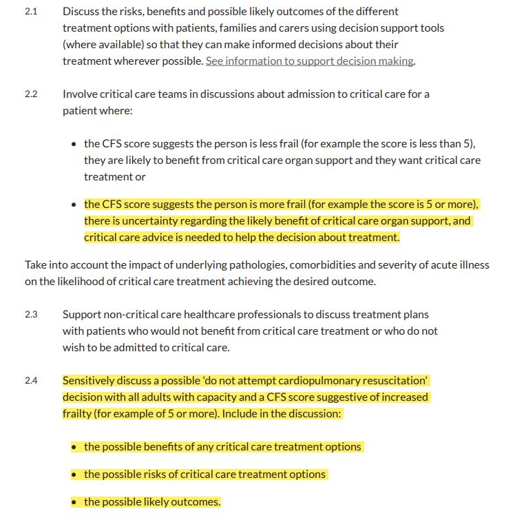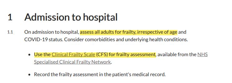 This indicated that all adults are assessed for frailty, irrespective of age and that (as set out below) a Clinical Frailty Score of 5 or more would lead to a discussion about a ‘do not attempt cardiopulmonary resuscitation’ decision.