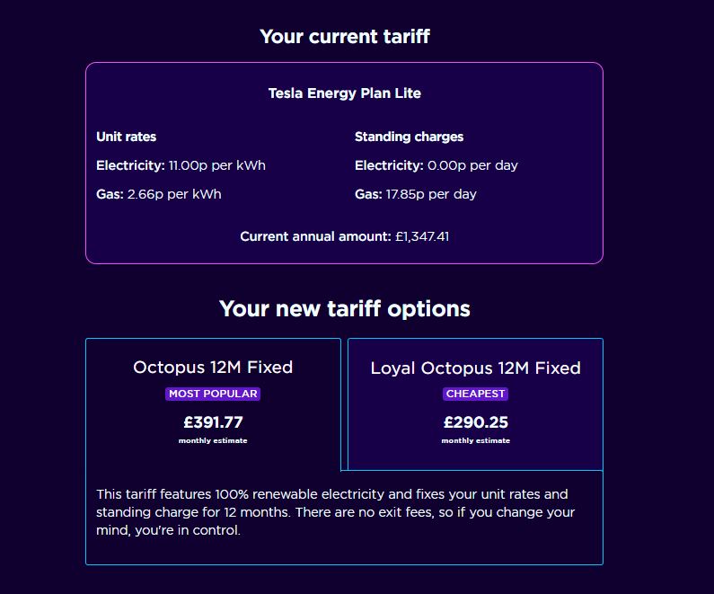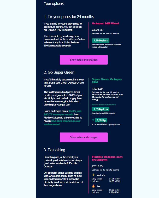 In addition to the above, when you are on your Octopus account page and click on ‘change tariff’ it will offer you just the two fixed rates – and give no indication of what the standard variable rate is, which is currently much cheaper. This does not strike me as being transparent in offering the best deal for customers.