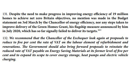 In the report, they discuss the issues around the rate of VAT on renewable energy products and installations and make (on page 45) the below recommendation in paragraph 132.