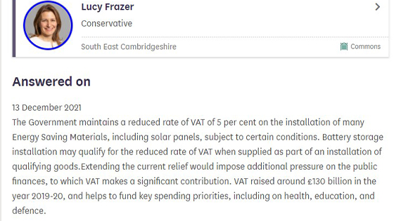 I raised the government’s refusal to reduce the VAT on solar panels and battery storage with my MP Richard Fuller and he tabled a written question on the issue.