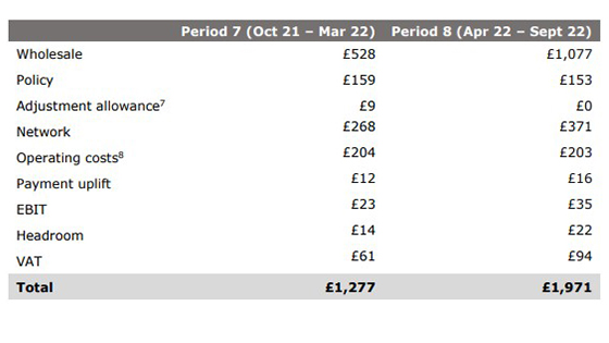 Further, the government’s VAT take is likely to be significantly increased by receipts from the sharp rise in the energy price cap which is set out in the table below. This sharp increase in VAT intake, from £61 up to £94 per customer, surely outweighs any loss in revenue from abolishing VAT on domestic renewable energy.