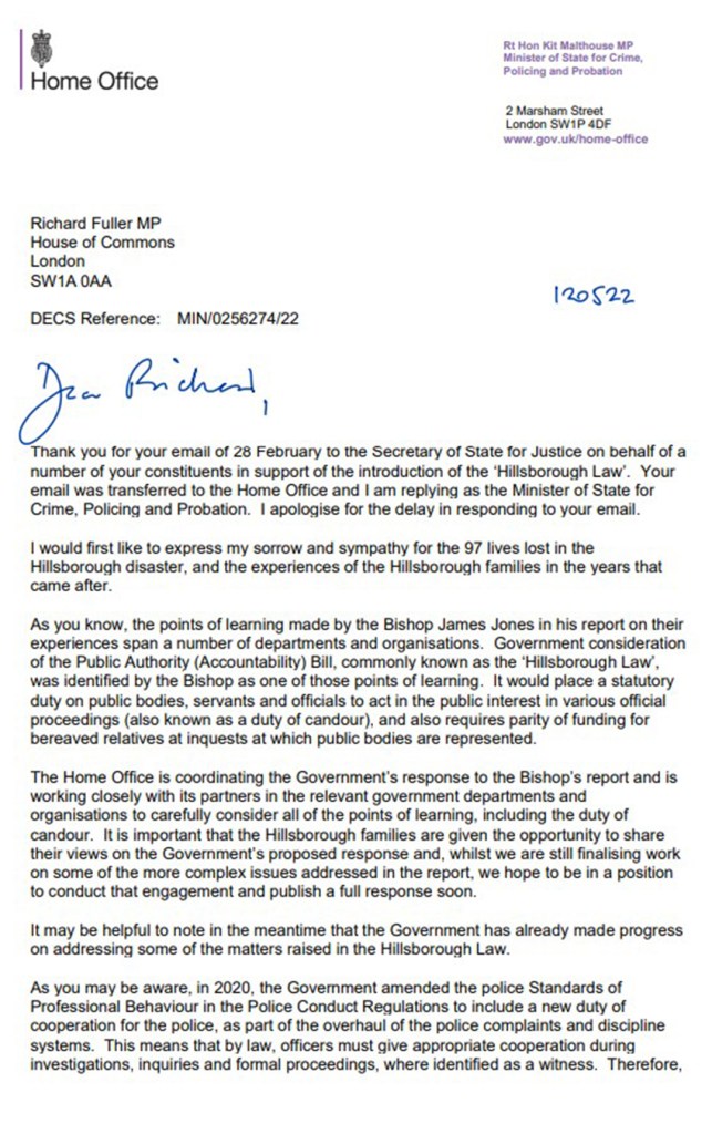 Almost five years on and it seems we are no nearer to a ‘full response’. In January I wrote to Richard Fuller MP setting out the urgent need for a ‘Hillsborough Law’ and asking for his support for it. You can read the letter, and his response in full here: https://julianvaughan.blog/2022/01/24/an-open-letter-on-the-need-for-a-hillsborough-law/
