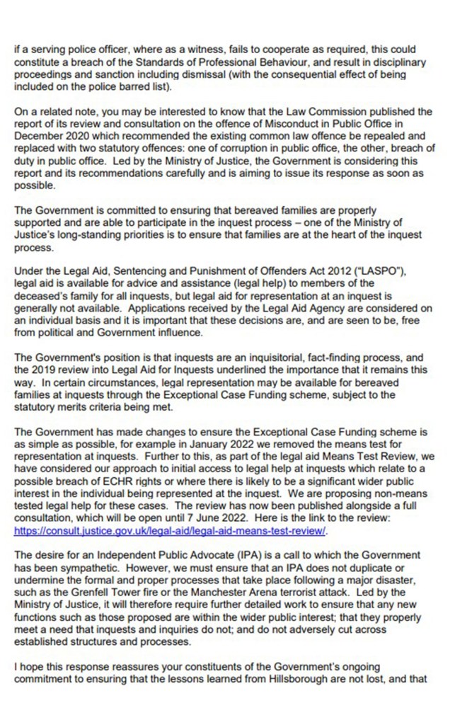The letter above raises a number of issues, but it is simply not good enough that five years on from a Home Secretary promising a ‘full response’ – and 33 years on from the disaster, we still have government ministers saying “we hope to be in a position to conduct that engagement (with the Hillsborough families) and publish a full response soon”. How slowly the wheels of justice turn for the ordinary people of the UK. The letter also talks about the potential availability of legal aid, which has been slashed since the Conservatives came to power in 2010. It also indicates that the governent may be rowing back on previous commitments to an Independent Public Advocate. We must do better than this.