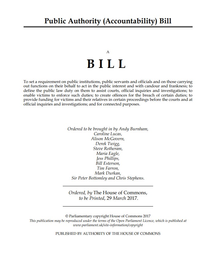 In March 2017 Andy Burnham, then MP for Leigh, sponsored a ‘Public Authority (Accountability) Bill’. This Private Members’ Bill set out measures to place a legal requirement on public institutions, public servants and officials and those carrying out functions on their behalf, to act in the public interest and with candour and frankness. Further, it would place a legal duty on them to assist official inquiries and investigations. In addition, it proposed how funding would be provided for victims and their relatives during court and inquiry proceedings. The Bill was due to have its 2nd reading on the 12th May 2017, but as a snap General Election was called Parliament was dissolved and the Bill fell.
