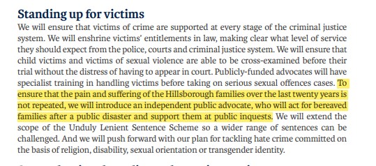 A commitment to an independent Public Advocate for the victims and families of those involved in disasters was included in the 2017 Conservative manifesto, although no action was taken on this and it made no appearance in their 2019 manifesto.