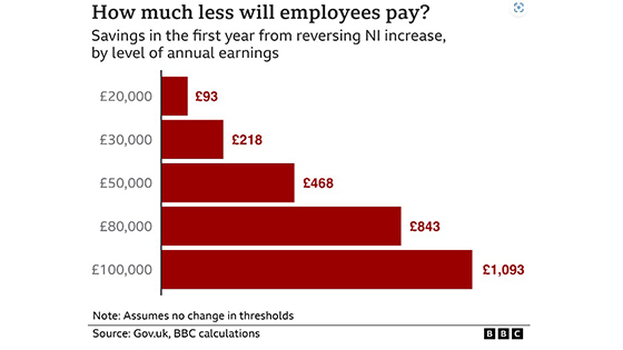 Another tax cut gleefully pulled out of the hat by the Chancellor was the 1.25% cut in the National Insurance rate from 6th November 2022. Again high earners will benefit far more than those on lower incomes as shown in the chart below. Kwasi Kwarteng could have retained the 1.25% increase for those earning above the ‘Upper Earning Limit’ currently £50,270 a year, but again chose to ensure that the richest gained the most.
