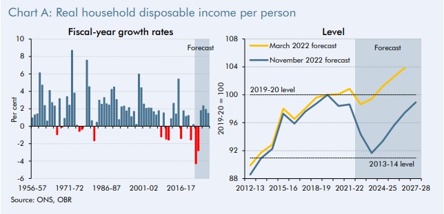 Tax as a share of Gross Domestic Product (GDP) is forecast to increase above 37%, the highest level since the 1940s. The outlook on living standards is dire with the next two years seeing the biggest fall in disposable income in generations.
