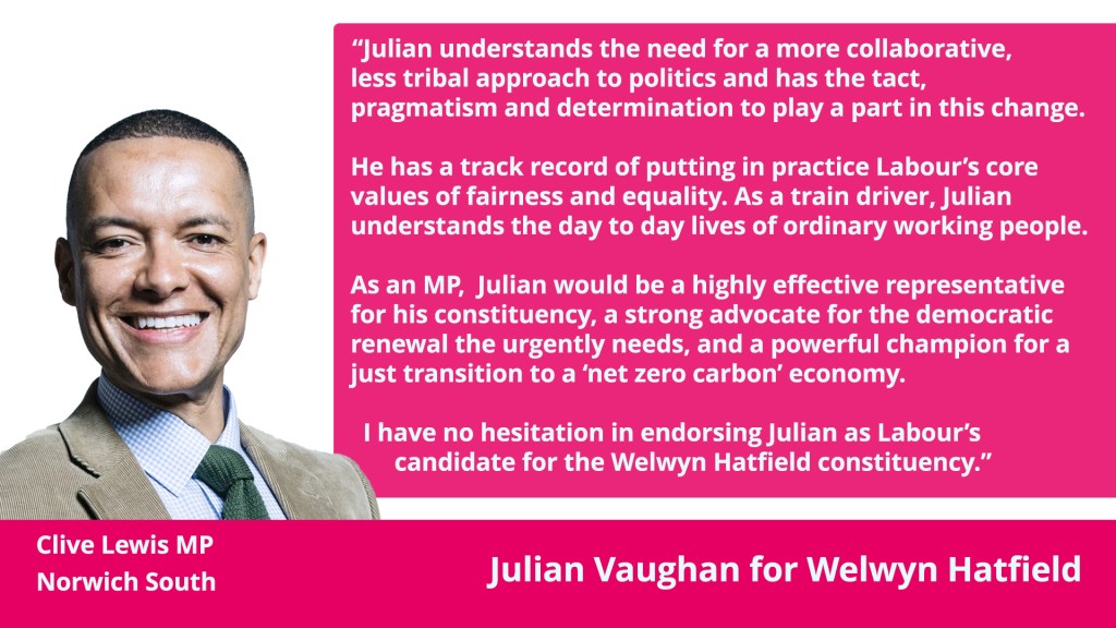 Julian Vaughan is standing to be selected as the Labour candidate for Welwyn Hatfield, having previously stood as the Labour candidate for NE Bedfordshire in the 2017 and 2019 General Elections and is endorsed by the ASLEF, GMB, Unite, USDAW and TSSA unions and also Open Labour. Julian was raised in the NE of England and was first politicised when a teenager by the 1984/5 Miners’ strike. Julian has been a train driver for 20 years and a union representative for the last 15 years. He also campaigns for an accessible rail network and writes regularly on a wide range of topics at julianvaughan.blog The post below sets out more about Julian, his views on what we need to do to win the next General Election and outlines his pledges to the constituents of Welwyn Hatfield.