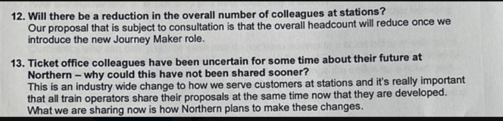 The rather more transparent Northern admits there will be an overall reduction in the headcount of station staff across their network, as per their answer to Q12 below.