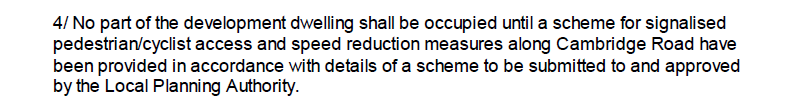 The planners’ response to the Highways Officer’s recommendations is far less straightforward and just as disappointing. It agrees that speed reduction measures should take place and the £80,000 figure, but states that these be de-linked from the delivery of the development. Crucially their reasoning for their decisions lacks any detail on the nature of the speed reduction and fails to mention anything about cycle or pedestrian access across the humpback bridge. As the proposals (whatever they are) have been de-linked from the development they were not included in the ‘recommended conditions’ which must be satisfied to enable the development to proceed.