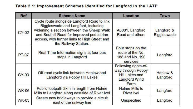 There is currently a significant gap in the National Cycle Network between Arlesey and Biggleswade and anyone cycling between these two towns has to share the road with cars and lorries or travel along poorly maintained unlit bridleways prone to flooding and barely suitable for cyclists commuting to work. Improvements to the cycle network in the Langford area (Langford is a sizeable village with 3,712 residents in 2021) have been identified for many years. These improvements were set out in the Local Area Transport Plan (LATP) for Arlesey and Stotfold, published in 2013 and covering the period between 2011 and 2026. The main areas of improvement are set out in the table below.
