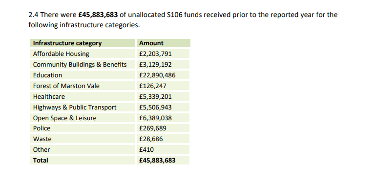 I note that while the collection of the money is set out per development, when the money is actually spent it is not clear from which development in which village this money originated from. Further, it is clear there is a substantial amount of money that has been received by the council, but has yet to be allocated. As this money could be held for a number of years it further reduces the transparency of the process. The table below shows the amount of unallocated money from previous years up to 2021/22. This figure of almost £46 million is a substantial increase in unallocated funds from just two years previously when the figure stood at £29 million. For reference, the ‘Leisure and Libraries’ budget for 2023/24 is £5.1 million.