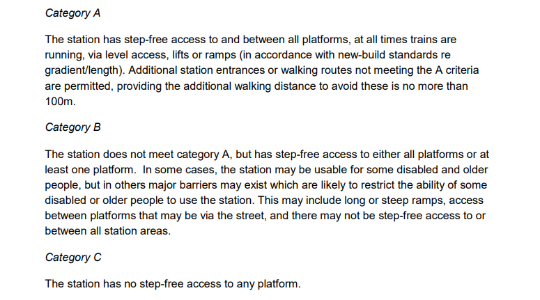An explanation of platform categories created by the office for Rail and Road is set out below. All train companies must provide the public with this information and grade their stations A, B or C: