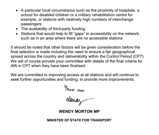 I have been told by a rail industry insider that the Department for Transport call for nominations letter for this round of funding stated: “Priority will be given to stations that currently have no access to and between platforms over stations where this is possible, even if the existing route is not ideal.”