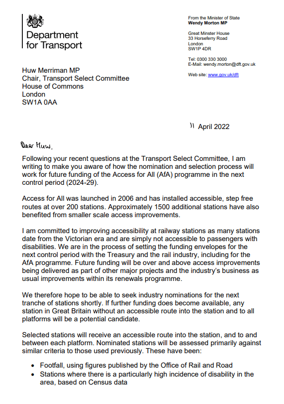 On 24th May 2024, the government announced the 50 stations set to benefit from the £350 million of funding for step-free access as part of the funding settlement for Control Period 7 (2024-2029). You can find the full list here: https://www.gov.uk/government/publications/railway-stations-awarded-access-for-all-accessibility-funding/railway-stations-awarded-access-for-all-accessibility-funding *South Croydon makes an appearance in this list, even though it was actually awarded funding in the March 2020 budget.