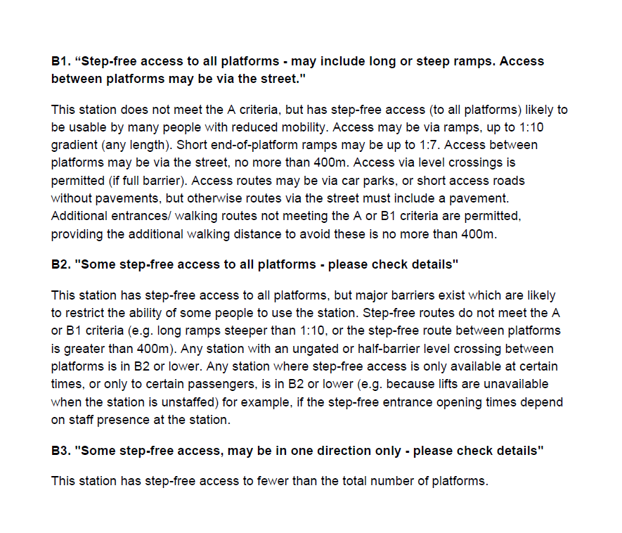 The Office for Rail and Road (ORR) also provides a sub-category for category B platforms. While it is not mandatory for train companies to provide this information, it is recommended.
