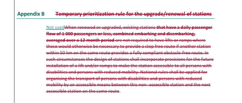 It took me some time to find ‘Appendix B’ within the ‘Persons with Reduced Mobility National Technical Specification Notice’ (PRM NTSN). You can find it below and it does permit the ‘passive’ provision for lifts – i.e. not installing them – when the passenger numbers of any station are below 365,000 a year – and there is an accessible station within 50km of the station. Some get out clause this!